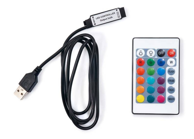 Za pomocą dołączonego pilota możemy sterować kolorem taśmy (6 kolorów + biały) zmieniać natężenie światła, wł/wył taśmę itp.